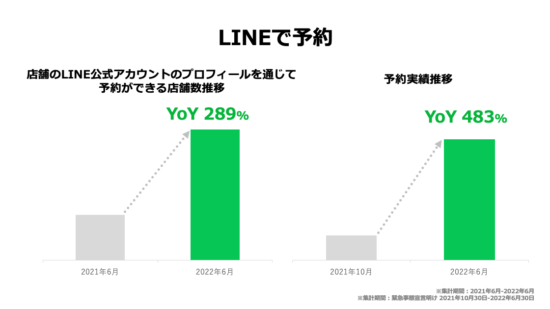 また、「LINEで予約」は、サービス開始から現在まで、ユーザー数が278万ユーザー*4を突破しており、LINE公式アカウントを通じて予約ができる店舗は、前年比約289%*3と大幅に増加しました。さらに予約実績においては、緊急事態宣言明けの2021年10月末から2022年6月末時点を比較すると、約483%と急成長を遂げています。