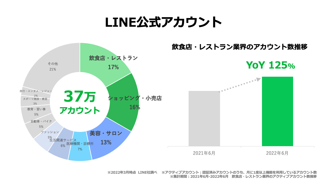 「LINE公式アカウント」は、現在、国内での認証済みアクティブアカウント数37万を超え*2、大規模企業のみならず、中小企業、飲食店などの店舗を含む幅広い業界・業種で顧客とのコミュニケーションツールとしてご活用いただいております。飲食店・レストラン業界の割合は、全体の17%*2と最も多く、前年比約125%*3と増加しています。