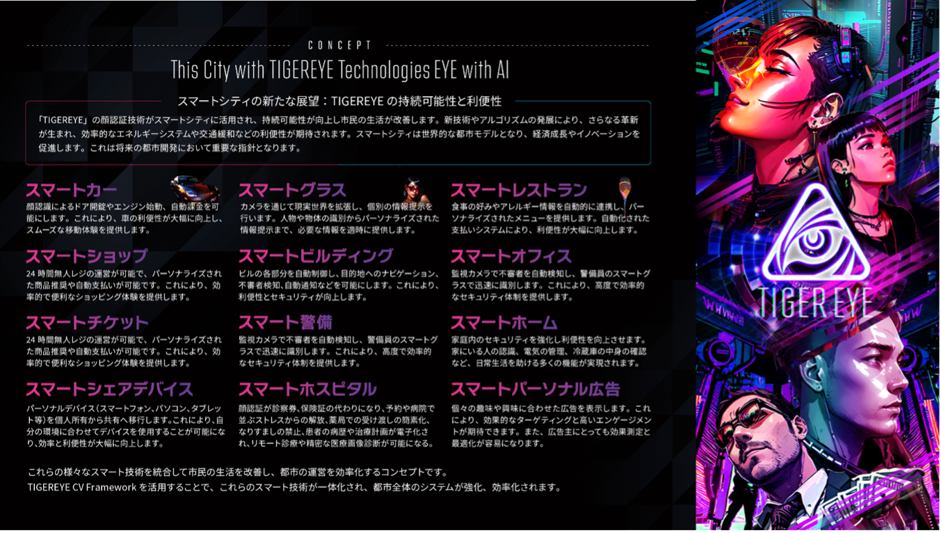 TIGEREYE COMPUTER VISION FRAMEWORKやTIGEREYE AUTH SCORINGがスマートシティ構築に活用されることで様々なスマート技術が一体化され、持続可能性が向上し、効率的なエネルギーシステムや生活の利便性が高まります。
