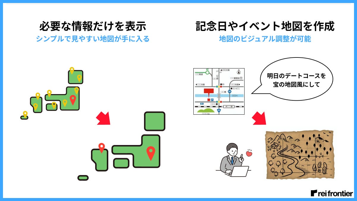 ・記念日やイベントなどに使用できる地図のビジュアル調整が可能