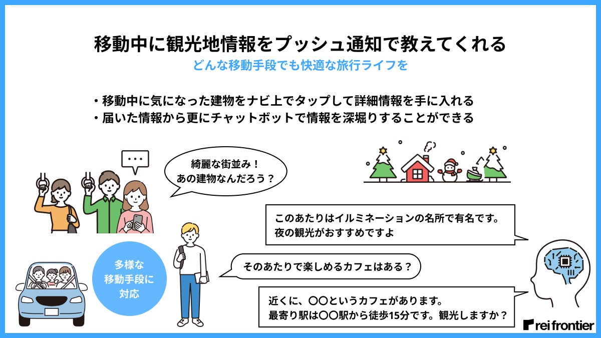 ・移動中に必要な観光地の情報をナビやプッシュ通知でAIが教えてくれる