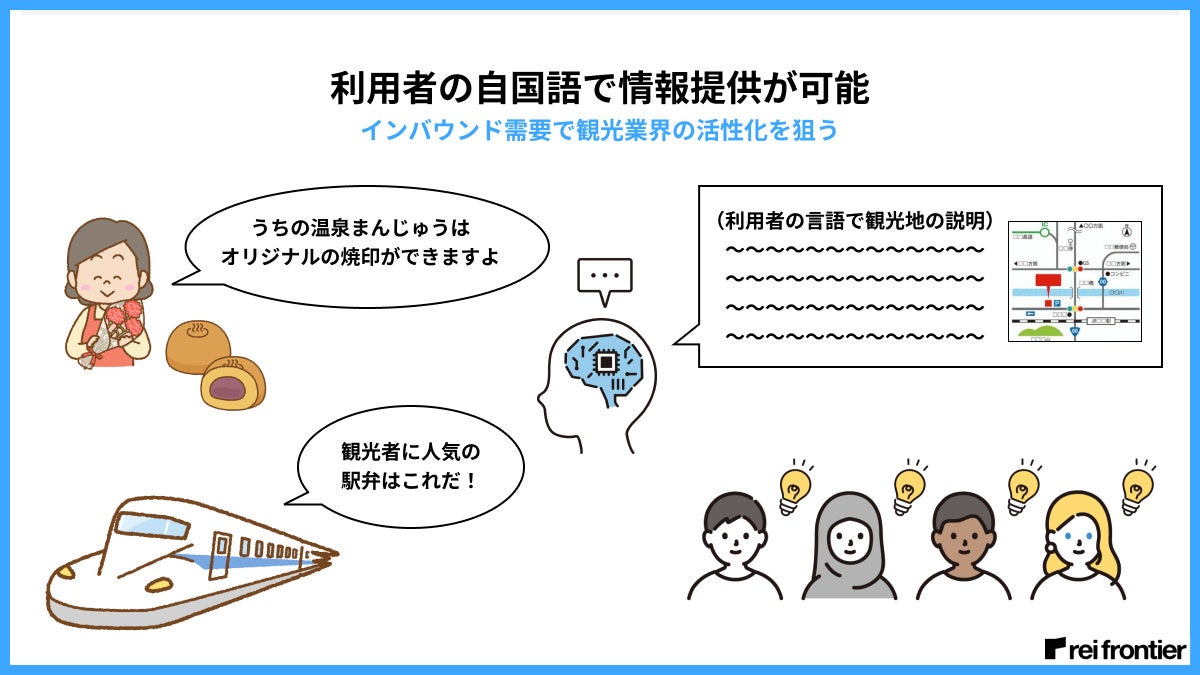 この技術により多言語対応によって訪日外国人とスムーズなコミュニケーションをとることができ観光事業者の対応も負担が軽減されるなど観光業やインバウンド需要においても革新的なサービスが提供されることが期待されます。