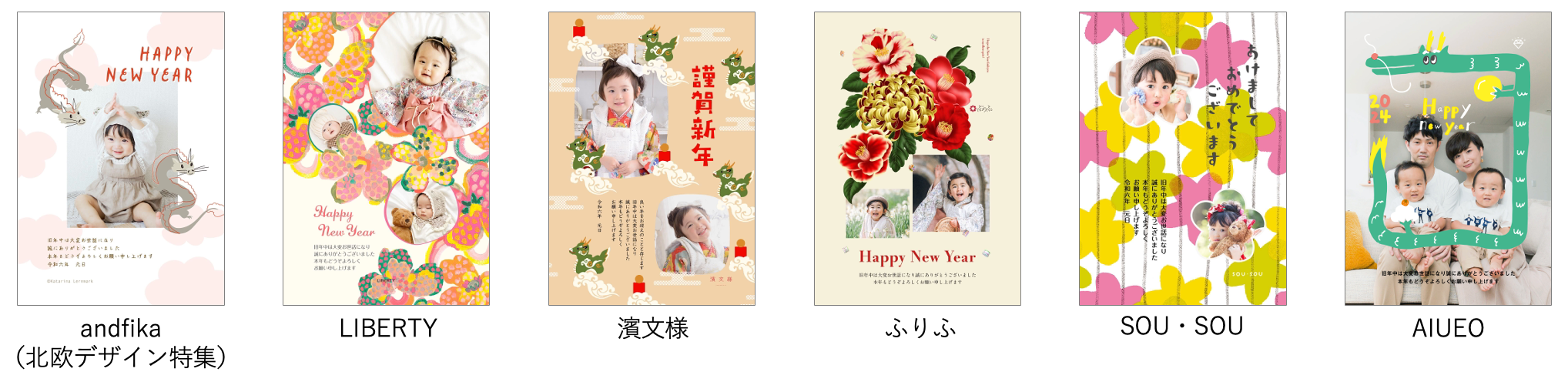 「スマホで年賀状™」でも特にママ層から人気の高いタイアップデザインが「スマホで写真年賀状」にも登場。家族写真にもぴったり合うデザインがさらに盛りだくさんになりました。