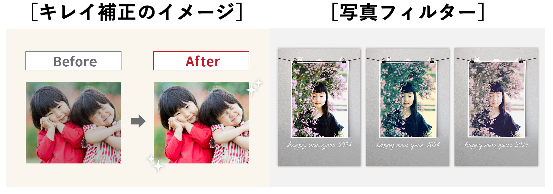 写真の色味を加工できる写真フィルターを全9パターンご用意。デザインのトーンと合わせた統一感あるデザイン作成をお楽しみいただけます。また、写真の明度や彩度を整える「キレイ補正」機能もご用意しています。
