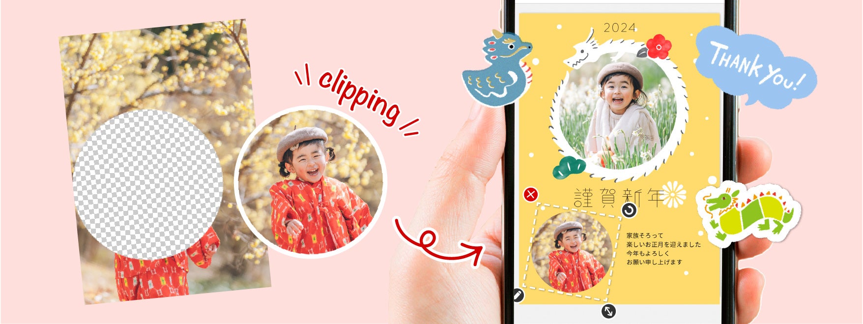 写真を人物やペットの形に切り抜いてスタンプとして使用することができる「スマホで写真年賀状」の人気機能「切り抜きフォト」。オリジナリティ溢れるこだわり写真年賀状を作りたいというお客様に毎年ご好評を頂いております。また、「切り抜きフォト」機能におすすめなデザインも多数ご用意しております。