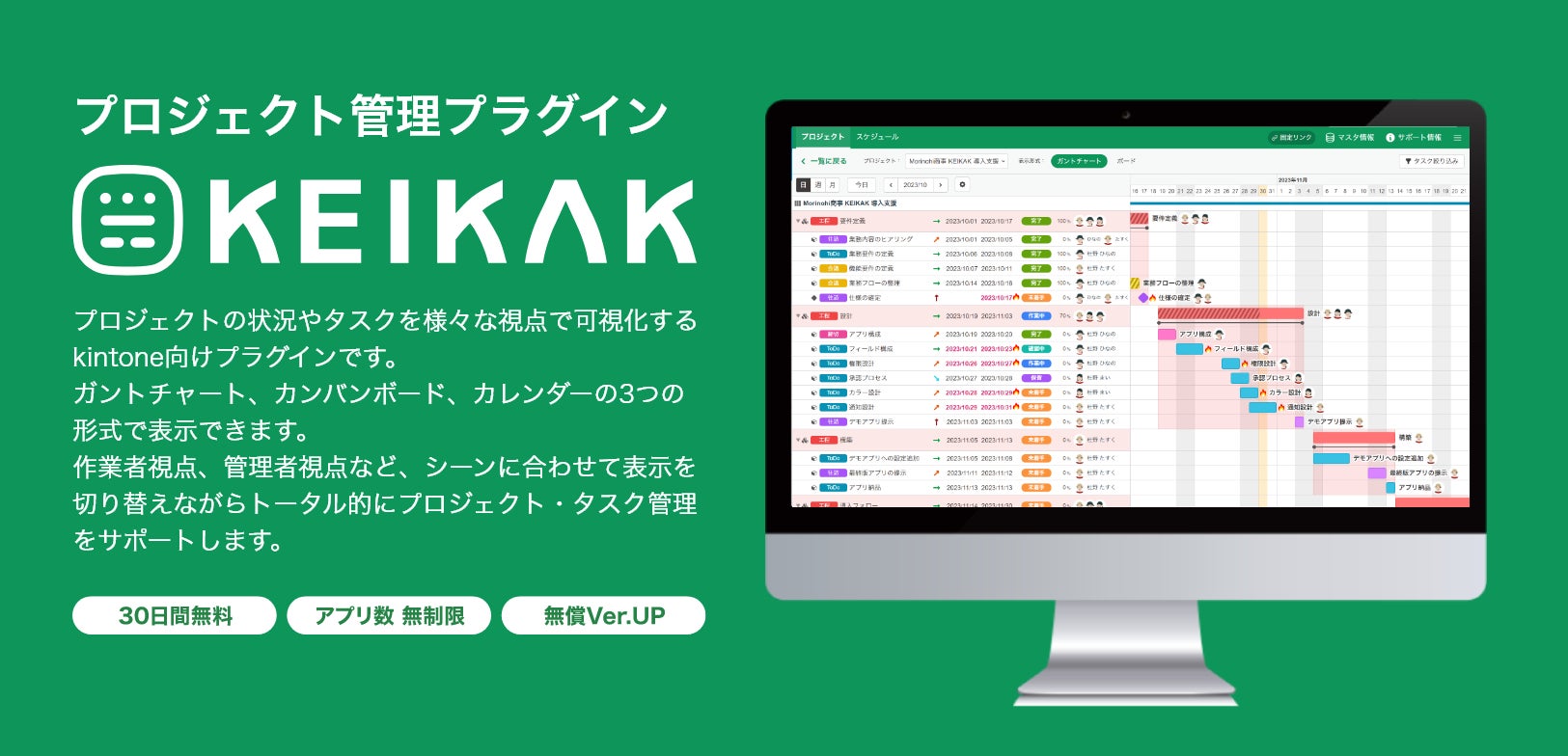 KEIKAKはkintone向けプロジェクト管理プラグインです。2023年9月11日にベータ版を公開以降、多くのみなさまにご利用いただき、機能追加要望などのフィードバックをいただきました。それを元に機能追加や改善を重ね、今回正式リリースする運びとなりました。