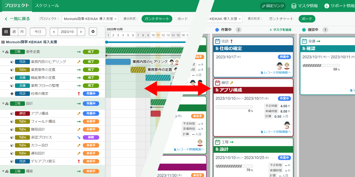 作業者視点、管理者視点で表示を切り替えながらドラッグ&ドロップの直感的な操作でトータル的にプロジェクト・タスク管理をサポートします。