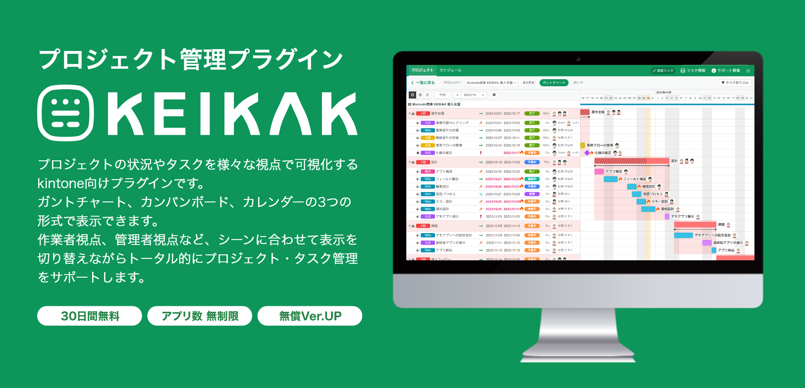 KEIKAKはkintone向けプロジェクト管理プラグインです。2023年9月11日にベータ版を公開以降、多くのみなさまにご利用いただき、機能追加要望などのフィードバックをいただきました。それを元に機能追加や改善を重ね、今回正式リリースする運びとなりました。