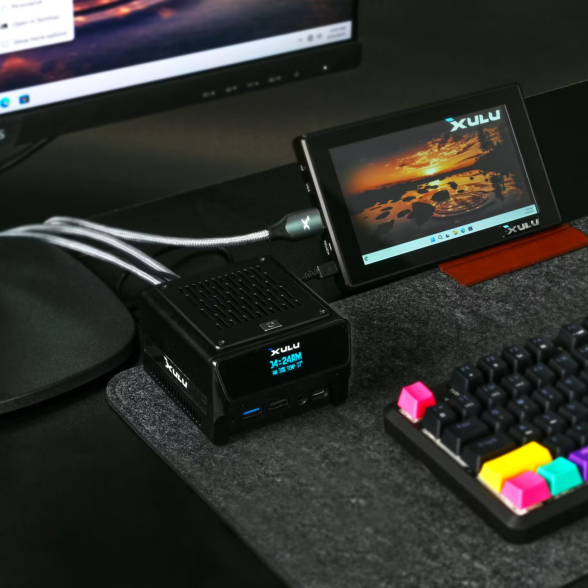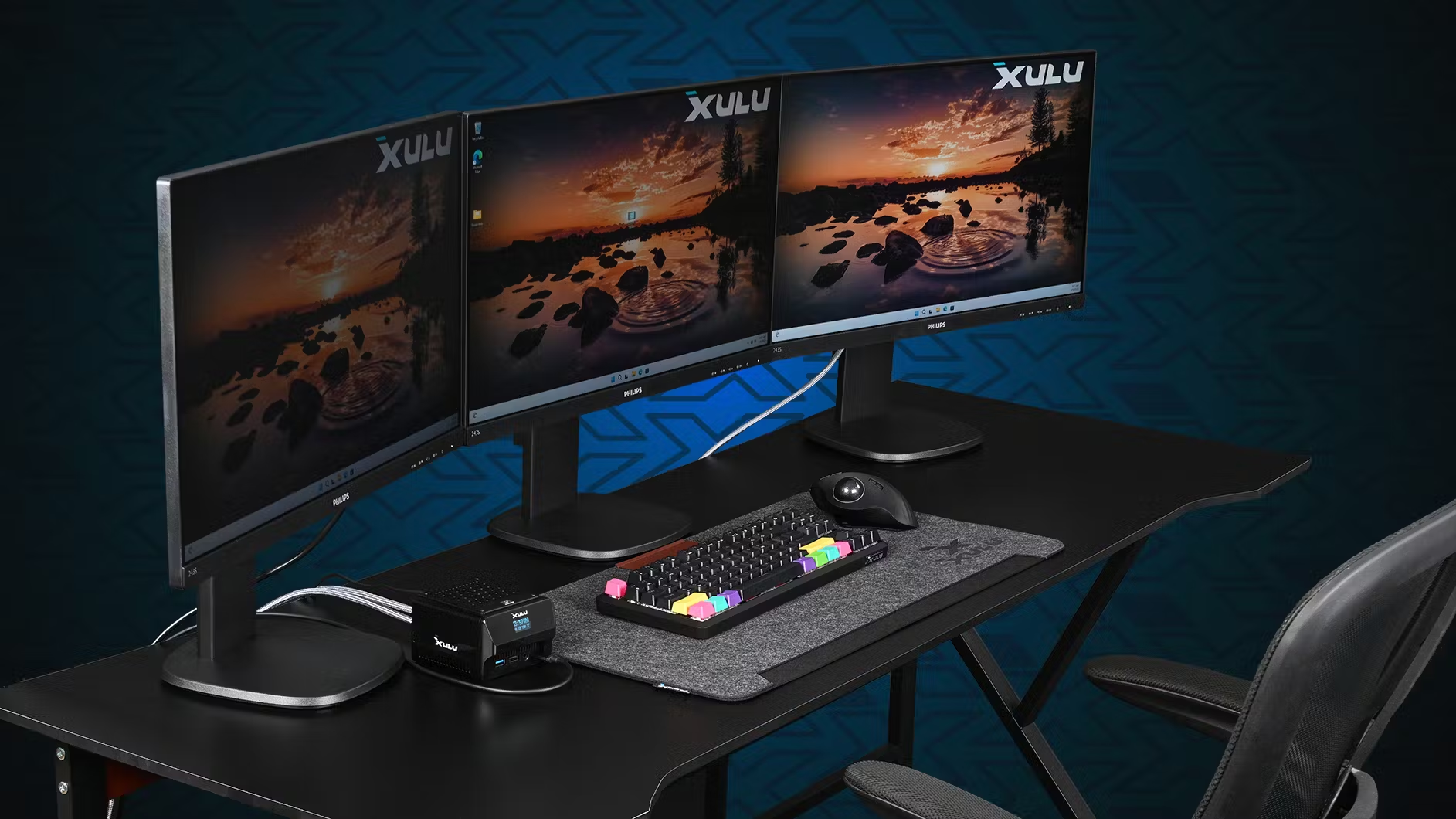 XULU XR1には、背面に2つのHDMI2.1ポートがあり、それぞれ最大48Gbpsまで対応しており(HDMI2.0に比べて30Gbpsのアドバンテージがあります)、4Kモニターを2つ接続できます。また、前面にはUSB-Cポートを介して1つのDisplayPortも備わっており、オーディオと共に最大8Kビデオを出力できるため、合計3つのディスプレイを使用してトリプルモニターの完全な体験が可能です。