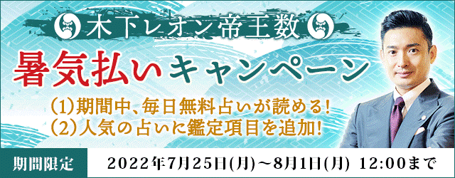 フジテレビ系列で放送中の占い番組『突然ですが占ってもいいですか?』で人気を博している木下レオン。ただいま、月額公式サイト『木下レオン◆帝王数』にて、『木下レオン帝王数 暑気払いキャンペーン』を公開中です。期間中、毎日無料占いが公開されるほか、サイト内で人気の占いメニューに鑑定項目を増量するお得なキャンペーンを開催いたします。ぜひこの機会にご利用ください。
