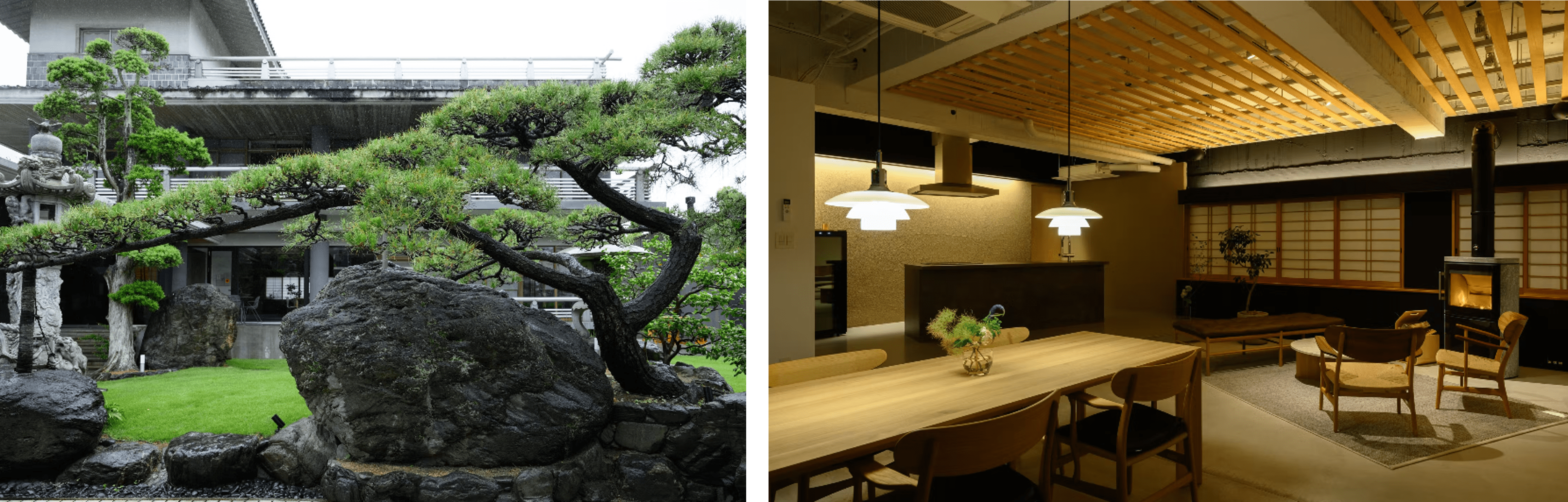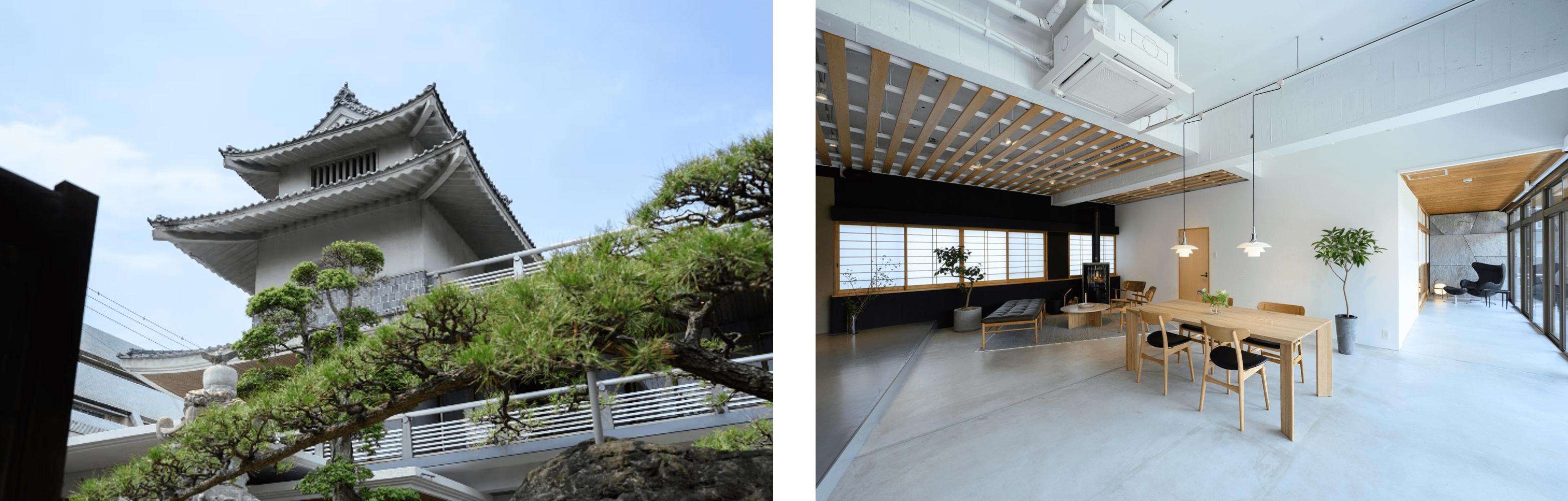 「穴吹邸」は一日一組限定で、一棟まるごと貸し切ってプライベートステイできる邸宅です。日本庭園、天守閣があり、日本らしさが感じられる、さながら「お城」のような佇まいとなっています。現オーナーの先代が住居として建てた邸宅をリノベーションし、2022年8月にリニューアルオープンしました。庭園には樹齢100年を超える穴吹邸のシンボルツリーとなる松の木や、石のオブジェなどが点在しており、モダンで快適な邸内からも臨め、自由に散策できます。