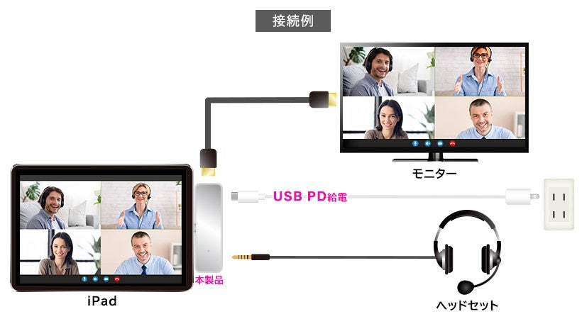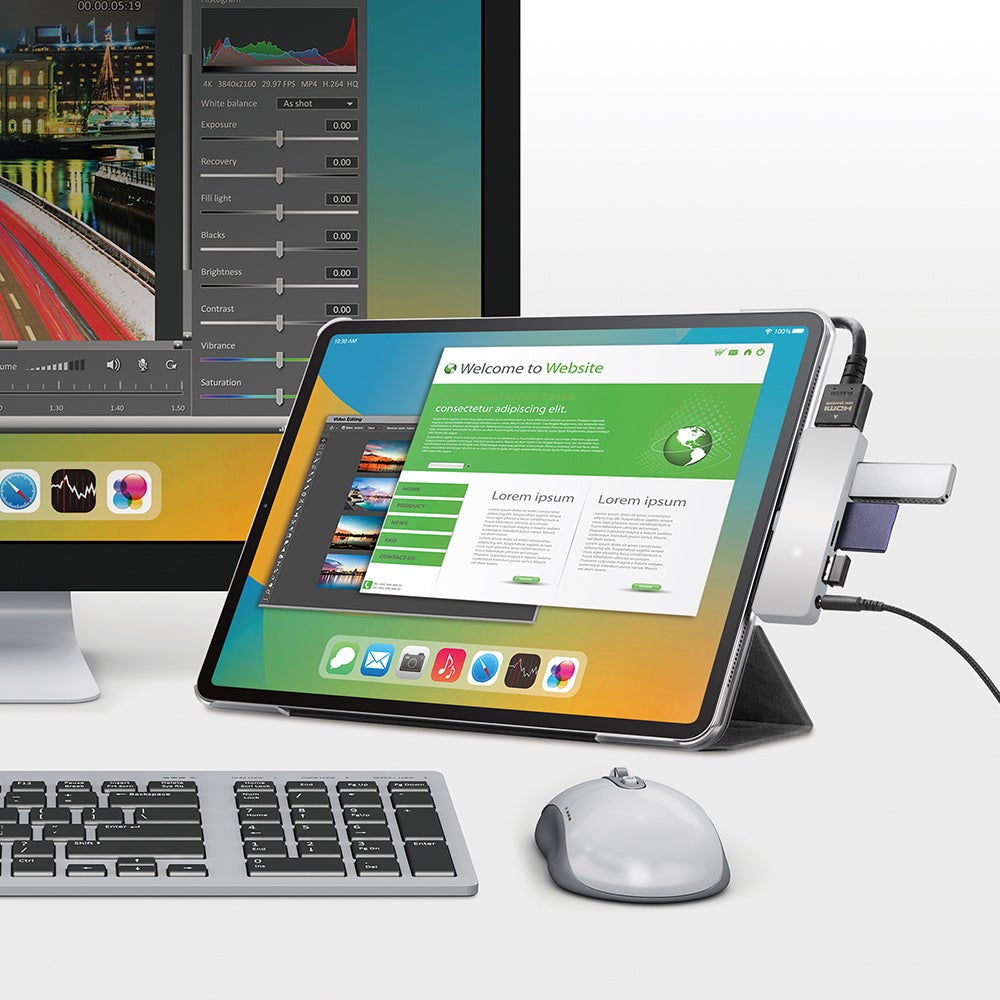本製品をiPadやiPhone15のUSB Type-C™ポートに挿し込むだけでUSB Type-C™(PD・データ転送共用)、USB Type-A 5Gbps、SD/microSDカードスロット、HDMI(最大4K60Hz出力対応)、ヘッドセット用3.5mm4極ピンジャックの増設が可能で、iPadをノートパソコンのようにご利用いただけます。