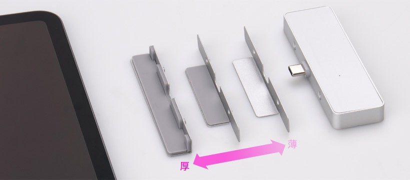 厚みの異なる独自設計のサポートプレートが3種類付属しています。iPadやiPhoneの画面に干渉しないため、保護フィルムなどに影響することなく高い装着強度を実現しました。装着したまま手持ちもできます。また、直接iPad に密着するため、ケーブル接続にありがちなUSB Type-C™ポートへの負担が心配ありません。