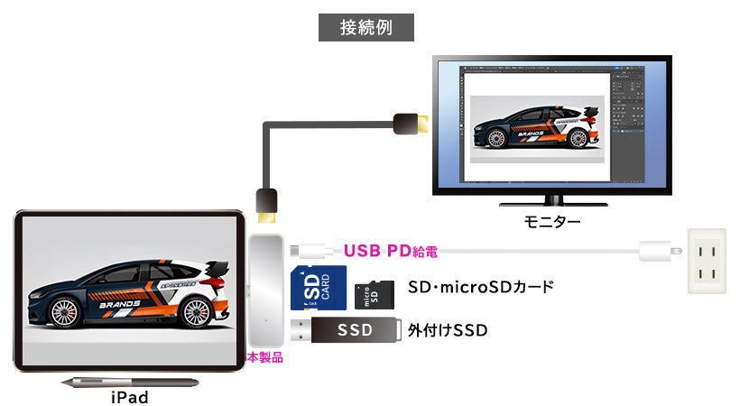 iPadとApple PencilでiPadをペンタブ(液タブ)として使う場合にも、iPad を充電しながら外部モニターに大きく表示して細部を編集できます。レイヤー数の多い大容量イメージも、USB 接続の SSD を接続することでスムーズに扱うことができます。