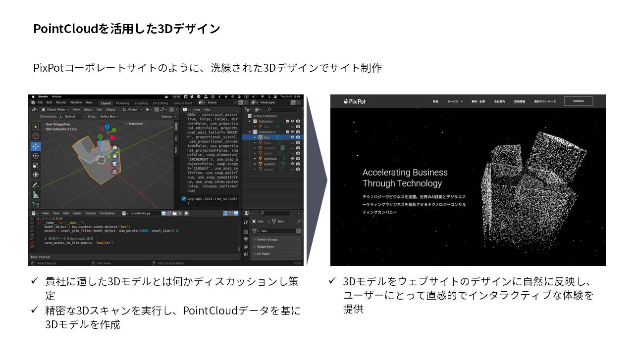 昨今、ウェブデザイン業界では、3Dデザインが注目されています。当社では、PointCloud技術に着目し、ウェブサイトに点群の3Dデザインを構築することが可能になりました。