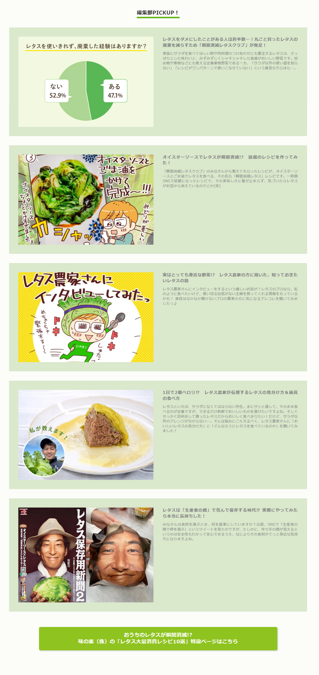 『レタスクラブ』では、レタスを知り尽くしたレタス農家の方々のおすすめのレシピなどを紹介する特設サイト「瞬間消滅レタスクラブ」を公開しています。実際にオイスターソースを使用したおいしいレタスの食べ方を再現したり、レタス生産者へのインタビュー、農家さん直伝のレタスにまつわるお役立ち情報などレタスにまつわる5本の記事を制作・公開しています。