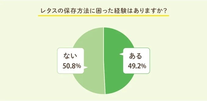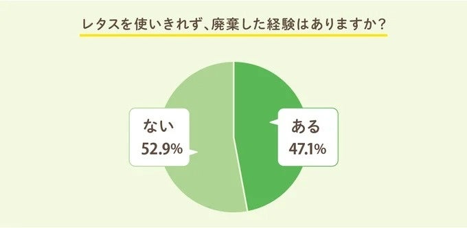2023 年 9月『レタスクラブ(WEB)』が実施した調査※によると、よく使う葉物野菜に約76%の人がレタスを選んだ一方で、47%の人がレタスを食べきれず廃棄した経験があり、49.2%の人がレタスの保存方法に困った経験を持つと回答しています(※2023年9月15日~24日、レタスクラブアンケート部「女性・既婚・子あり・23歳~50歳」187人の回答より)。