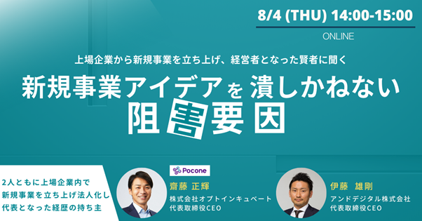 そこで、本ウェビナーでは様々な企業のPoCを支援し、数々の新規事業を成功へ導いてきたオプトインキュベート 齋藤 正輝と、実際にMVPを用いて新規事業の立ち上げを行ったアンドデジタル 伊藤 雄剛が、新規事業を立ち上げる際に陥りそうになった危機や進行を阻害した要因、PoC、MVPのプロセスで重要視した点について対談いたします。