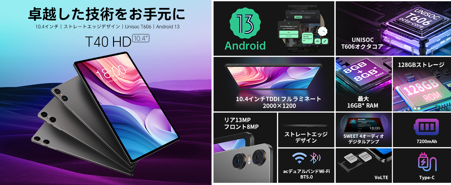 10.4インチ / Android 13 / 16GB+128GB+1TB TF拡張 / 2K IPSインセルディスプレイ / 4G LTE+5G WiFiモデル / Widevine L1対応 / GPS機能サポート