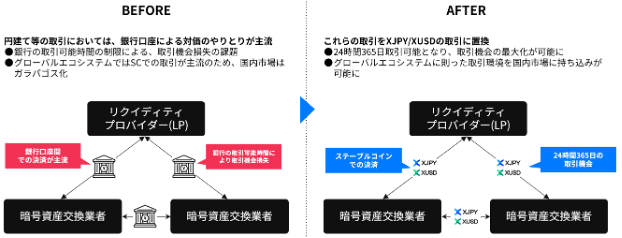 本共同検討を通じて、暗号資産業界におけるクロスボーダー取引の決済効率向上を目指した円貨建ての「XJPY」と米ドル建ての「XUSD」の2銘柄のステーブルコイン発行を行います。