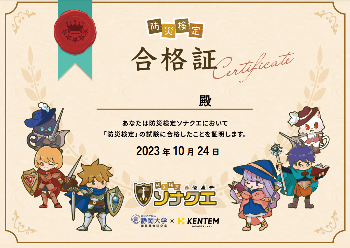 最終ステージとなる、「防災検定」では全ての災害に関する問題が出題されます。防災検定を見事クリアした人には、「合格証」が発行できるようになります。
