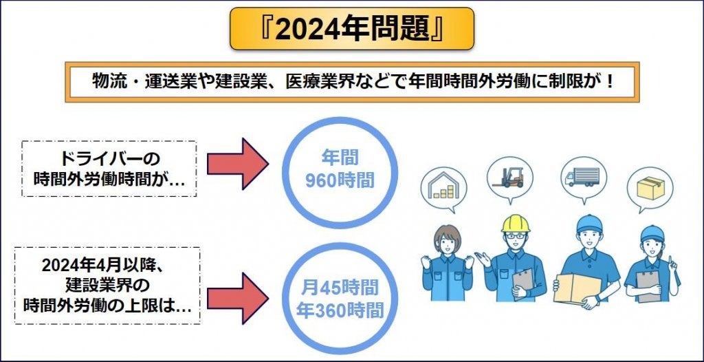 建設業では、2024年4月より時間外労働時間に罰則付きで上限が設けられます。さらに医療業界も、医師の時間外労働時間が年間1,800時間を超えるケースがあるといった問題から、医師の時間外労働時間に上限が規制されます。これらの労働時間の全体的な削減により生じる「2024年問題」に対応するには、業務の見直しやAIやデジタルツールの導入による業務効率の向上が必要とされています。