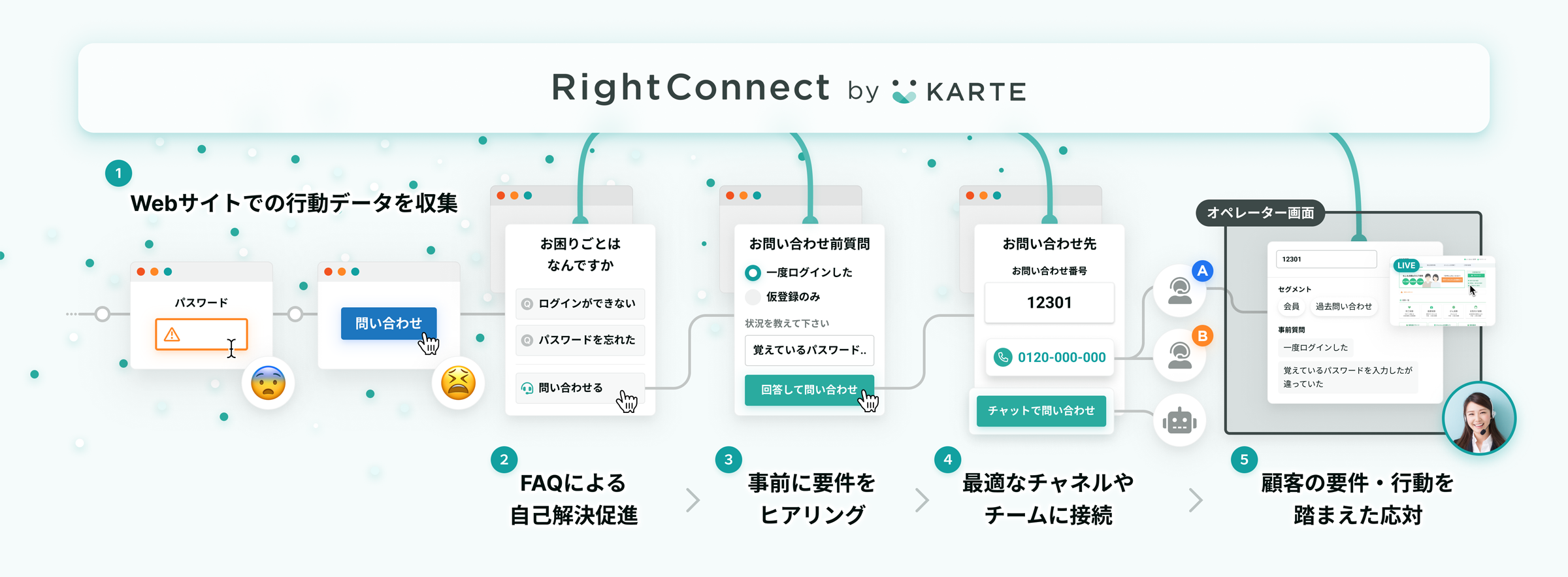 そこで、エクレクトとRightTouchは、各種WebチャネルとクラウドCTIの連携が可能な「RightConnect by KARTE」の提供を開始します。本連携により、顧客がコンタクトセンターに問い合わせをしてきた本質的な理由を把握しつつ、最適なチャネルかつ最適な部署に連携することが可能です。また、オペレーターは、顧客の用件と行動を把握した上で電話に応じることができるため、スムーズな回答が可能になります。これにより、顧客の問い合わせストレス軽減とオペレーターの対応コスト削減を実現します。