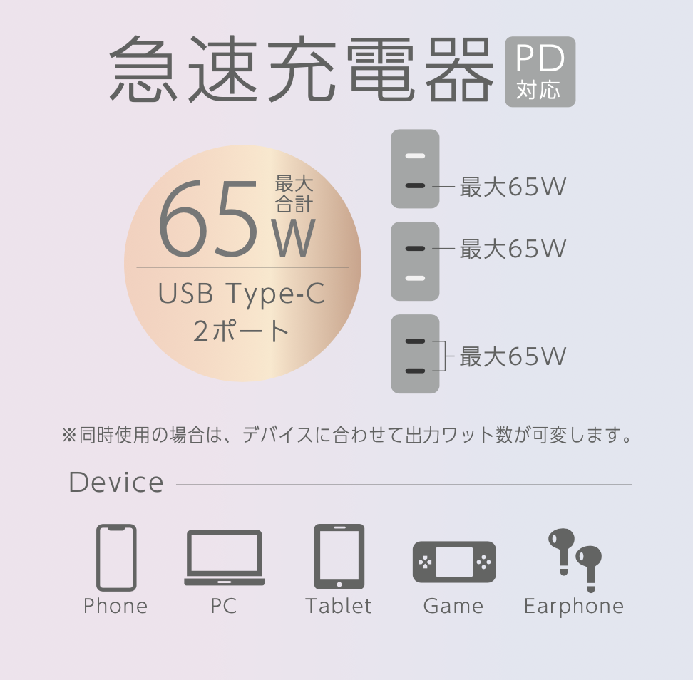 ※C1/C2いずれかのポートをご使用時65W以下給電のパソコンに対応しております。C1/C2同時使用の場合は、2ポート合計最大出力65Wで可変します。