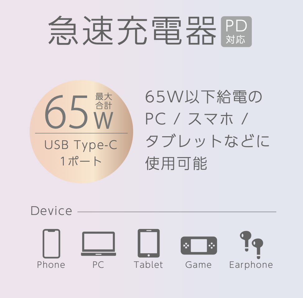スマホやタブレットだけではなく、パソコンにも充電が可能です。※65W以下給電のパソコンに対応しております。