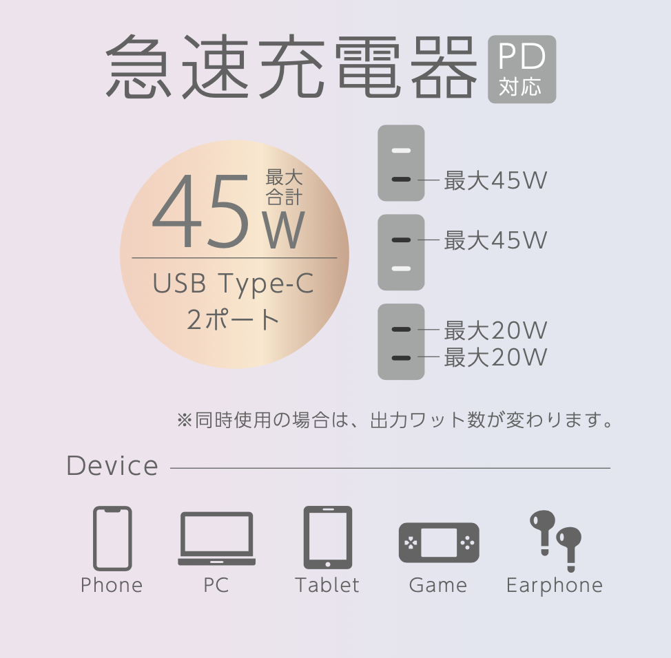 ※C1/C2いずれかのポートをご使用時45W以下給電のパソコンに対応しております。C1/C2同時使用の場合は、スマホ/タブレットへの2台同時急速充電(20W+20W)が可能です。