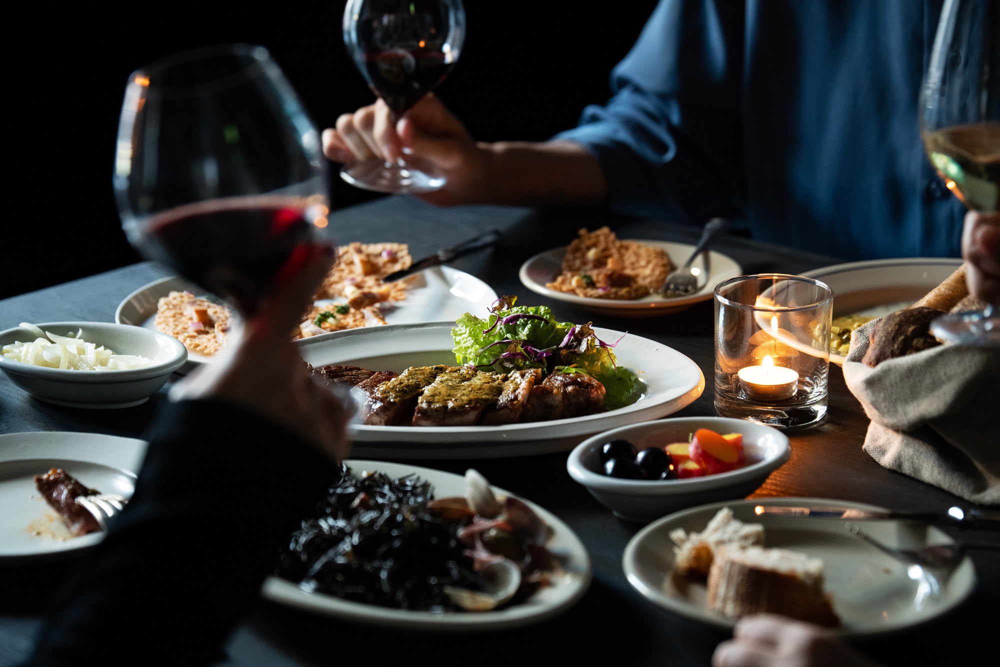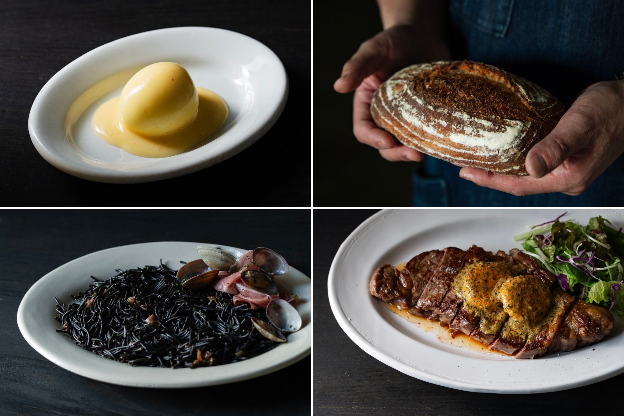 展示スペースの裏側に回り込むと、そこはまさに舞台裏。暗がりのなかにシェフのいる厨房が浮かび上がり、奥にはテーブルやカウンターが並んでいます。メニューは「クラシックなウフマヨ」や「自家製ロースハムのグリル」などシンプルで気楽な前菜から「いわて短角牛のサーロインステーキ」など本格的なメインディッシュまで。シェフが毎日お店で焼き上げる自家製パンドカンパーニュは食事と合わせても、お酒のつまみとしても。アートを鑑賞したあとにビールやワインを片手に語り合う時間をお楽しみいただけます。