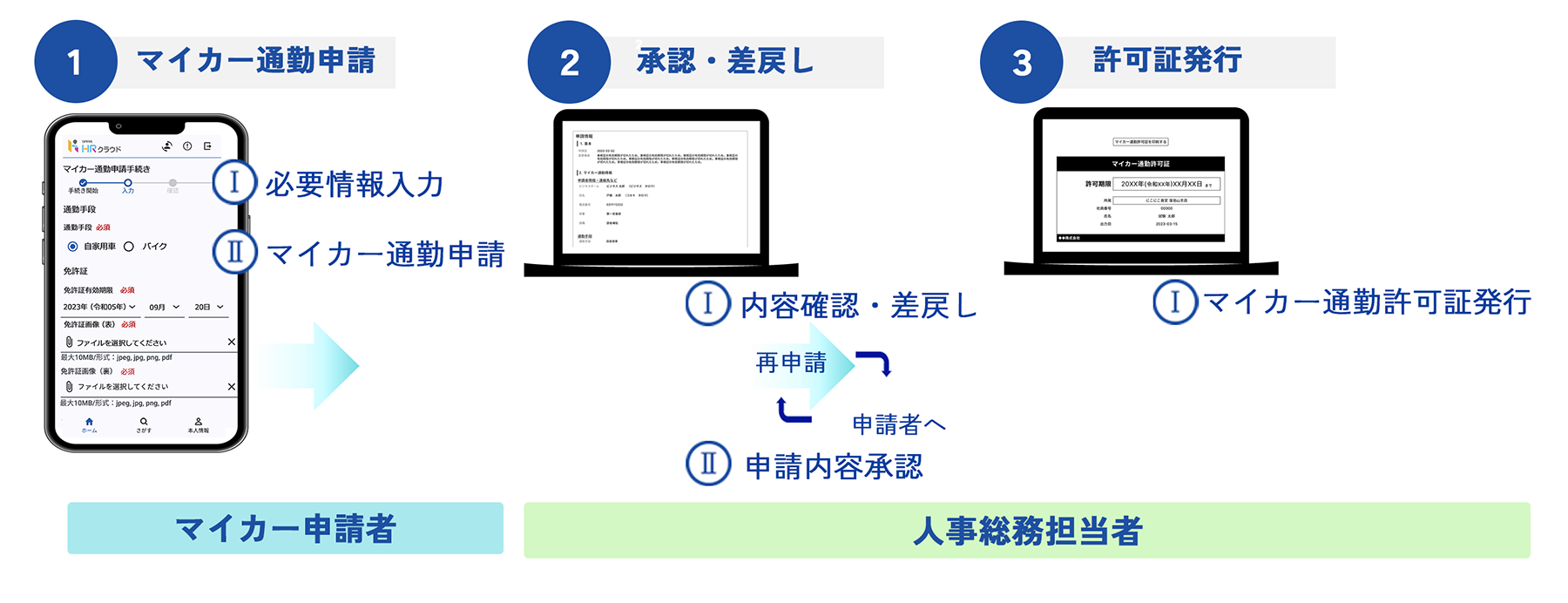 このマイカー通勤管理業務においては、申請書、車検証・自動車保険証書のコピーのFAXなど、紙によるやり取りや、申請不備の際の電話対応、従業員ごとに異なる自動車保険の契約期間管理などを行わなければならず、人事総務部門の担当者の大きな業務負担となっています。