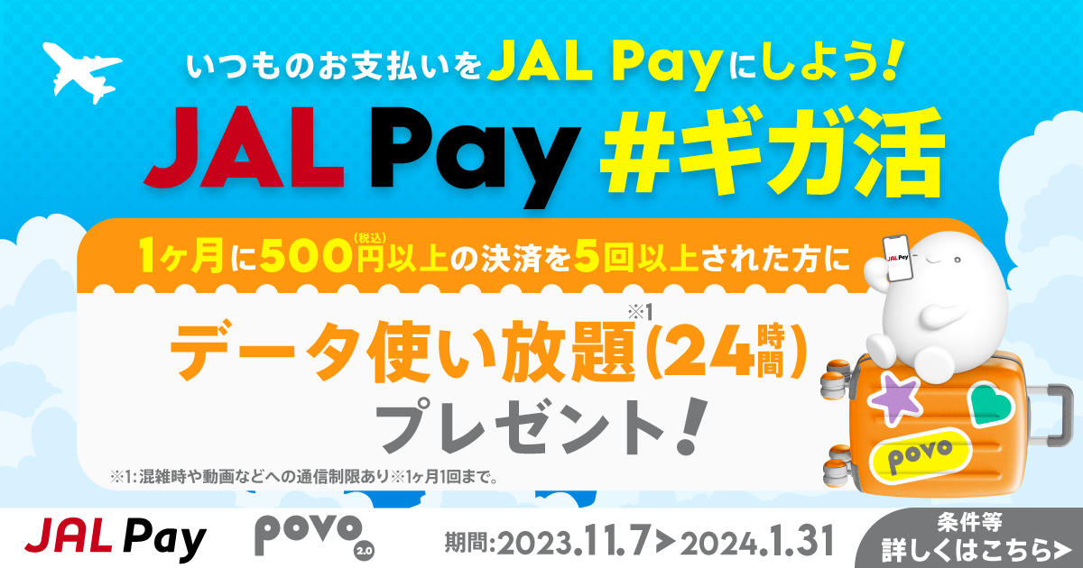 キャンペーンのエントリーおよび詳細はこちら( https://www.jal.co.jp/jp/ja/jmb/jalpay/pay/campaign/jalpaypovo2311/ )