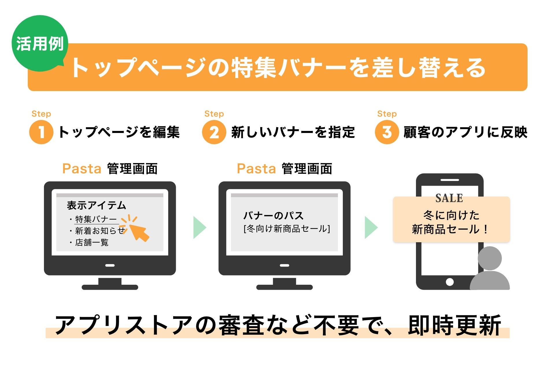 Pasta でアプリを構築すると、プッシュ配信・お知らせ配信といったマーケティング施策はもちろん、店舗情報管理・掲載バナー変更・デザイン変更なども管理画面からプログラミング不要で行えます。