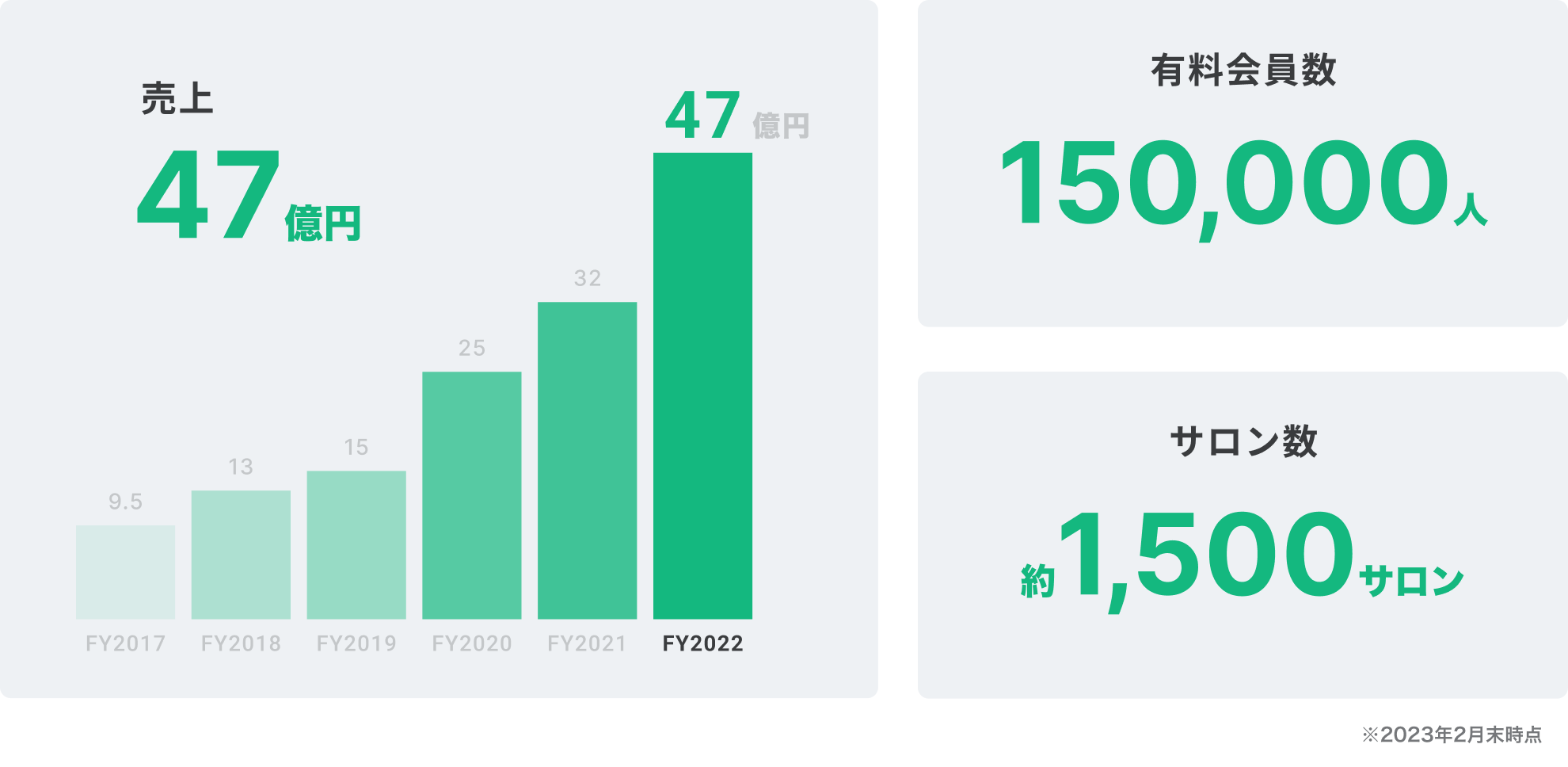 現在運営されているサロンの数は1,500以上、有料会員数は15万人を超え、流通総額は約50億円まで成長しています。(2023年10月現在)