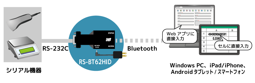 Bluetooth RS-232C 変換アダプター(HID Profileモデル)は、RS-232C機器から出力されるデータを、キーボードイベントとして 取り込み可能なデバイスです。受信データはExcelシートのセルやテキストエディタ、Webアプリなどに直接文字として入力できます。