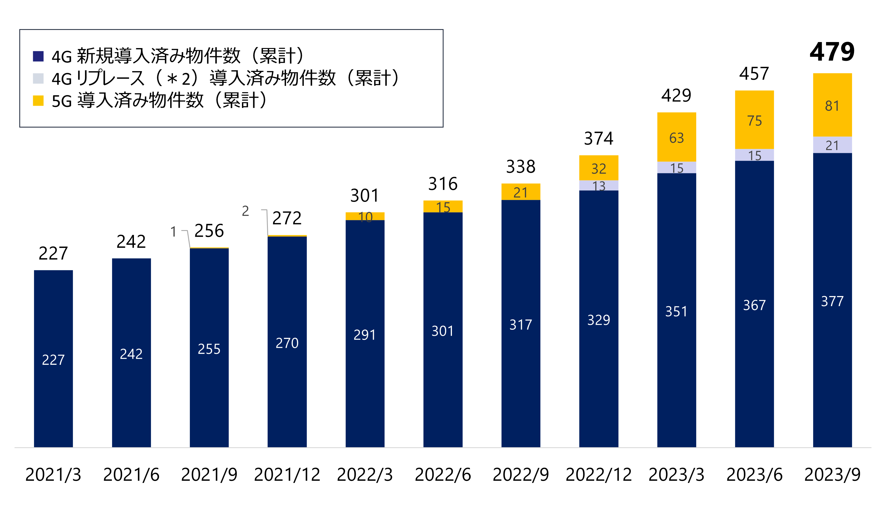 2023年9月時点の累計導入済物件数(4G/5G、国内)は479件(前年同期比141.7%)となりました。うち5Gは81件となり、前年同期(21件)から順調に増加しました。