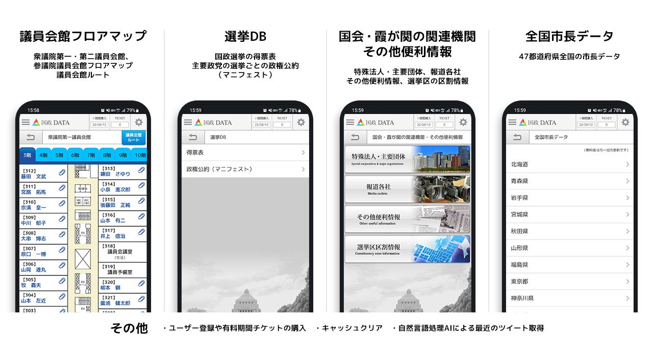 衆議員・参議院の国会議員すべての顔写真、選挙区、議員略歴、党会派、所属委員会、連絡先、秘書名などを見やすく整理、また、衆議院議員会館・参議院議員会館のフロアマップも網羅し、各議員の「政治活動近況報告」の配信や、議員会館を回る際のルートやそれに伴うメモを保存できる機能「議員会館ルート」などの機能も設けています。