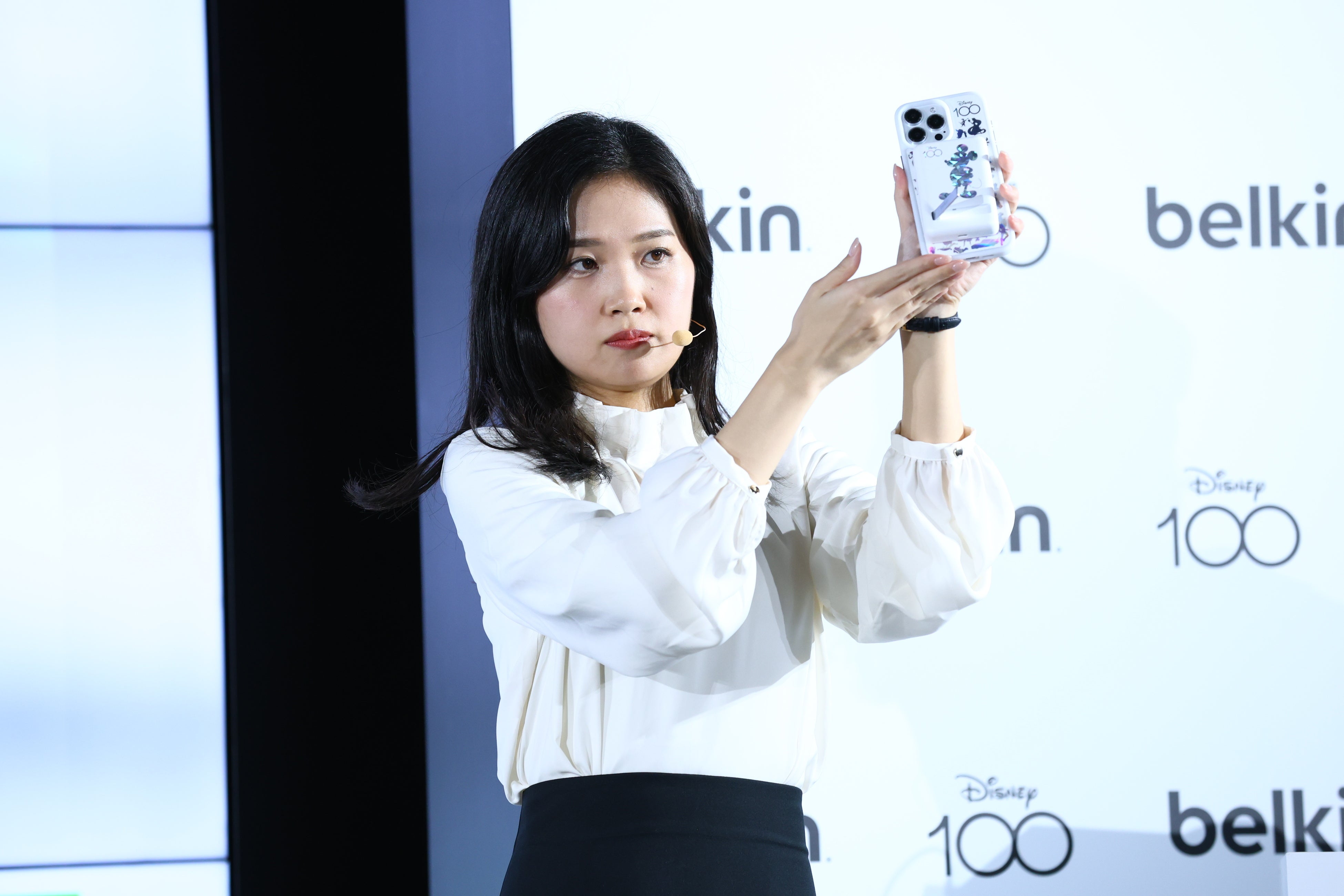 ベルキンインターナショナル General Manager, Asia Jenny Ngよりご挨拶とプレゼンテーション、ベルキン株式会社 Head of Offline Sales 古賀 淳とベルキン株式会社 Merchandiser 河野 有実からは製品紹介が行われました。今年40周年を迎えたベルキンの今までのあゆみや進化や特長、グローバルでの展開、持続可能性へのコミットメントまで、広くブランドについて紹介を行ったほか、今回のメインテーマであるディズニーの新製品紹介では、スローガンの「Be Ready For Magic」というかけ声と共に、アンベールの演出が行われました。テクノロジーで人々をつなぐベルキンとストーリーテリングで人々をつなぐディズニーならではの取り組みの背景や、ラインナップやコンセプトについて、Disney100、「トイ・ストーリー」、『アナと雪の女王』、そして「MARVEL」と、ベルキンならではの製品の魅力が語られました。