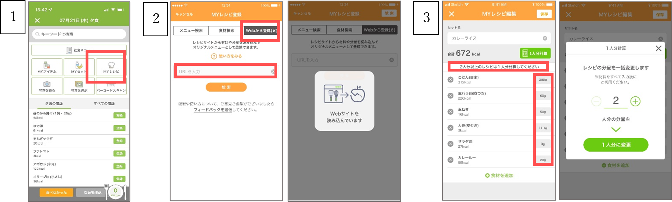 レシピサイトなどで公開されているレシピ情報を参考にして作った食事を『あすけん』に登録する際、当該WebサイトのURLを入力するだけで、材料や分量を自動的に読み込み、登録が完了します。使用した材料や調味料を変えた場合は、簡単に実際の分量に変更することも可能です。