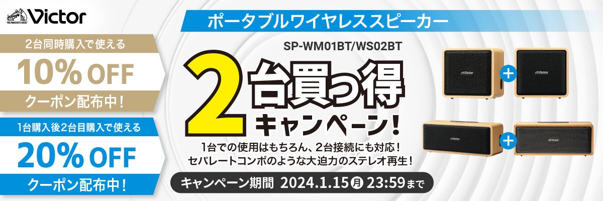 公式オンラインストア「JVCケンウッドストア」にて、2023年11月9日(木)~2024年1月15日(月)の期間中に「SP-WS02BT」 「SP-WM01BT」のいずれかを購入された方に限り、同モデルの2台目を購入する際に使用できる20%OFFクーポンをプレゼントします。また、同じモデルを2台同時購入される方には10%OFFクーポンが適用されます。