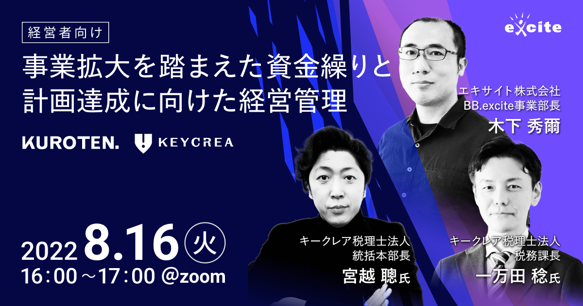 エキサイト株式会社(所在地:東京都港区、代表取締役社長:西條 晋一)は、キークレア税理士法人(所在地:福岡市中央区、代表社員税理士:三嶋 泰代)の統括本部長・宮越 聰氏、税務課長・一万田 稔氏を迎え、2022年8月16日(火)16:00より「事業拡大を踏まえた資金繰りと計画達成に向けた経営管理」をテーマに参加費無料のウェビナーを開催することをお知らせします。