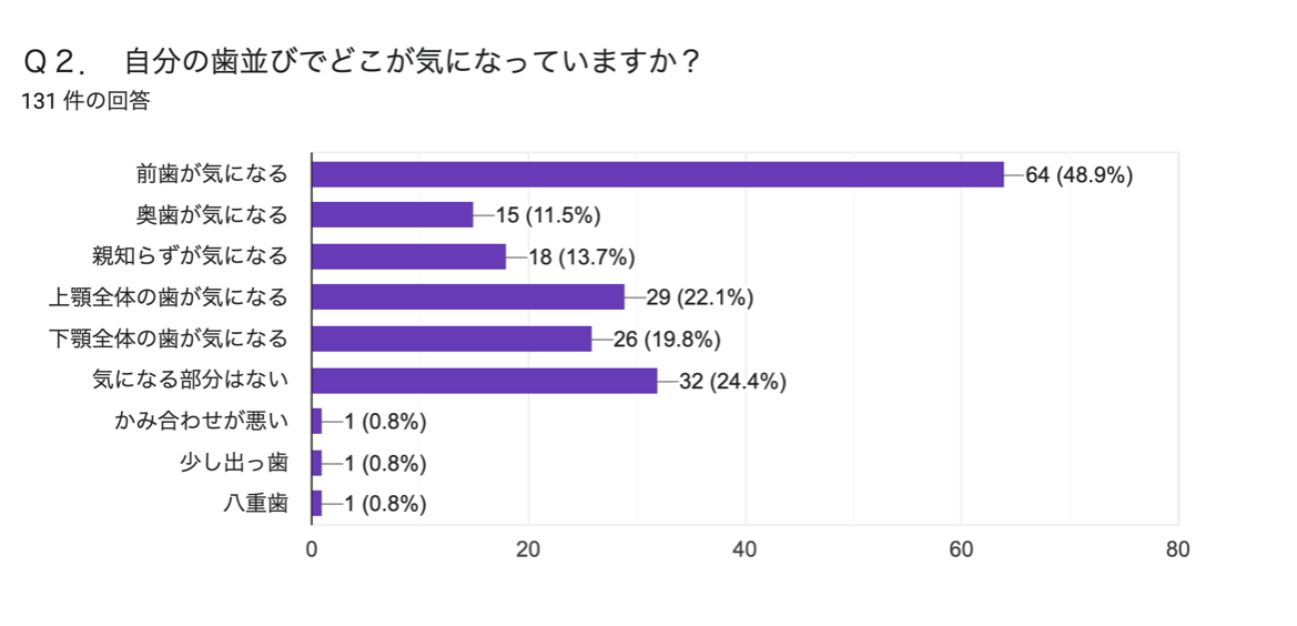今回の調査で、約7割の人が自分の歯並びについて部分的・全体的に気になると回答しており、自分の歯並びで気になっているところを尋ねると、最も多いのが「前歯(48.9%)」、次いで「気になる部分は無い(32%)」、「上顎全体の歯(22.1%)」でした。