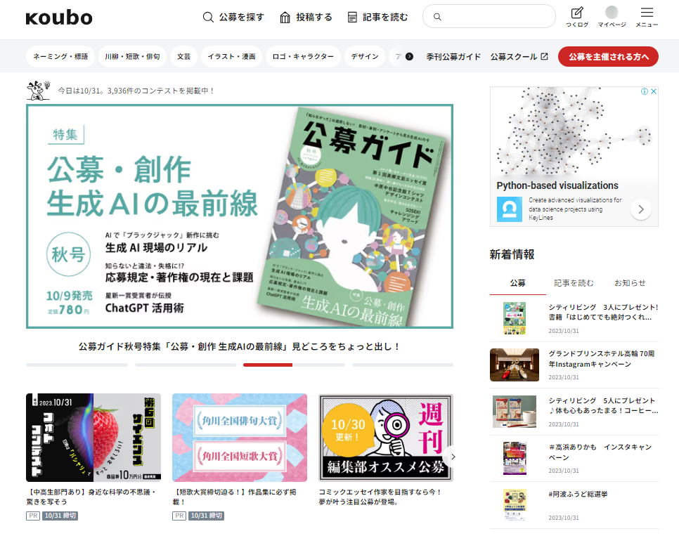 「Koubo」は年間約3万件の公募情報を掲載・紹介している日本最大級のコンテスト情報アプリです。2023年2月に「公募ガイドONLINE」を「Koubo」に全面リニューアルし、コンテスト情報の網羅性および検索性をより向上させるとともに、創作のハウツー・著名人へのインタビューなど、コンテスト応募や創作に役立つ記事の発信などもおこなっています。志向しているのは、クリエイターが創作を楽しめ、主催者が迷いなく公募を開催でき、結果としてすぐれた作品が集まることで、クリエイターと主催者それぞれがワクワクできるようなマッチングサービスです。