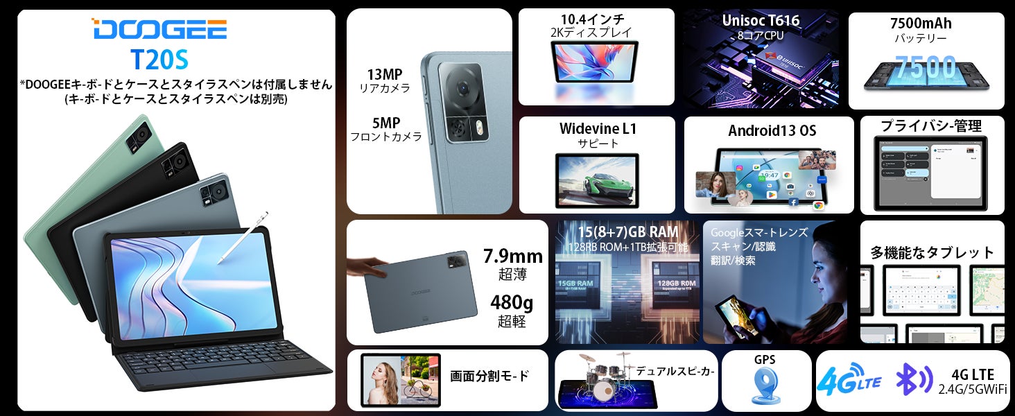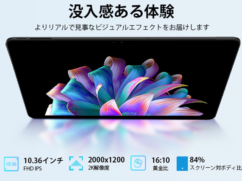 15GB RAM(8GB+7GB拡張)+128GB ROM+1TB拡張可能、UnisocT616 8コアCPU、10.4インチ FHD IPS 2Kディスプレイ+WideVine L1対応+4G LTEモデル, 13MP/5MPカメラ+7500mAh+児童守護+無線投影+画面分割