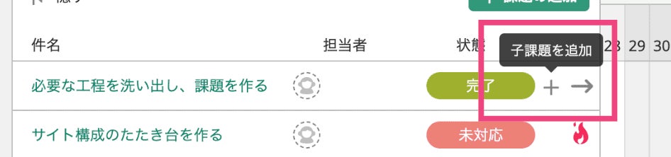 「課題を追加」ボタンが追加されたことで、これまでは別の画面に遷移しないと不可能だった、ガントチャート画面上での課題・子課題追加が可能になりました。