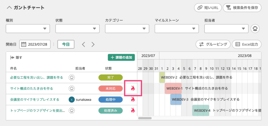 課題の期限日が過ぎているにも関わらず状態が「完了」になっていない課題には、炎アイコンを表示するように改善しました。遅れが出ている課題にいち早く気付くことが可能です。