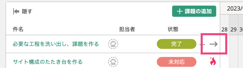 課題がガントチャートの表示期間の外にある際も、「→」アイコンをクリックすることで、ガントチャートの表示期間が自動的に移動し、課題をすぐに確認できるようになりました。