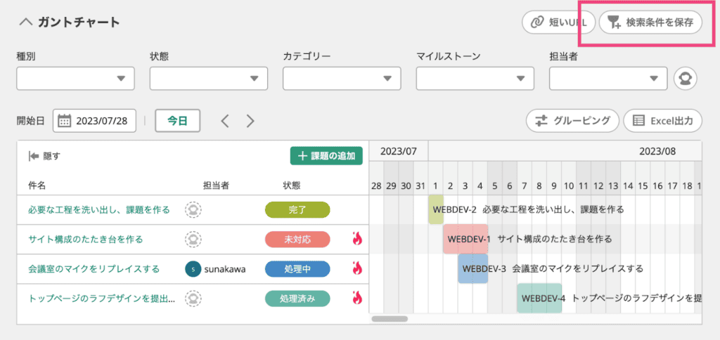 これまで「ボード」等の画面では可能だった「検索条件を保存」をガントチャートでも実現しました。