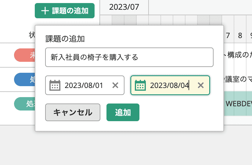 「課題を追加」ボタンが追加されたことで、これまでは別の画面に遷移しないと不可能だった、ガントチャート画面上での課題・子課題追加が可能になりました。